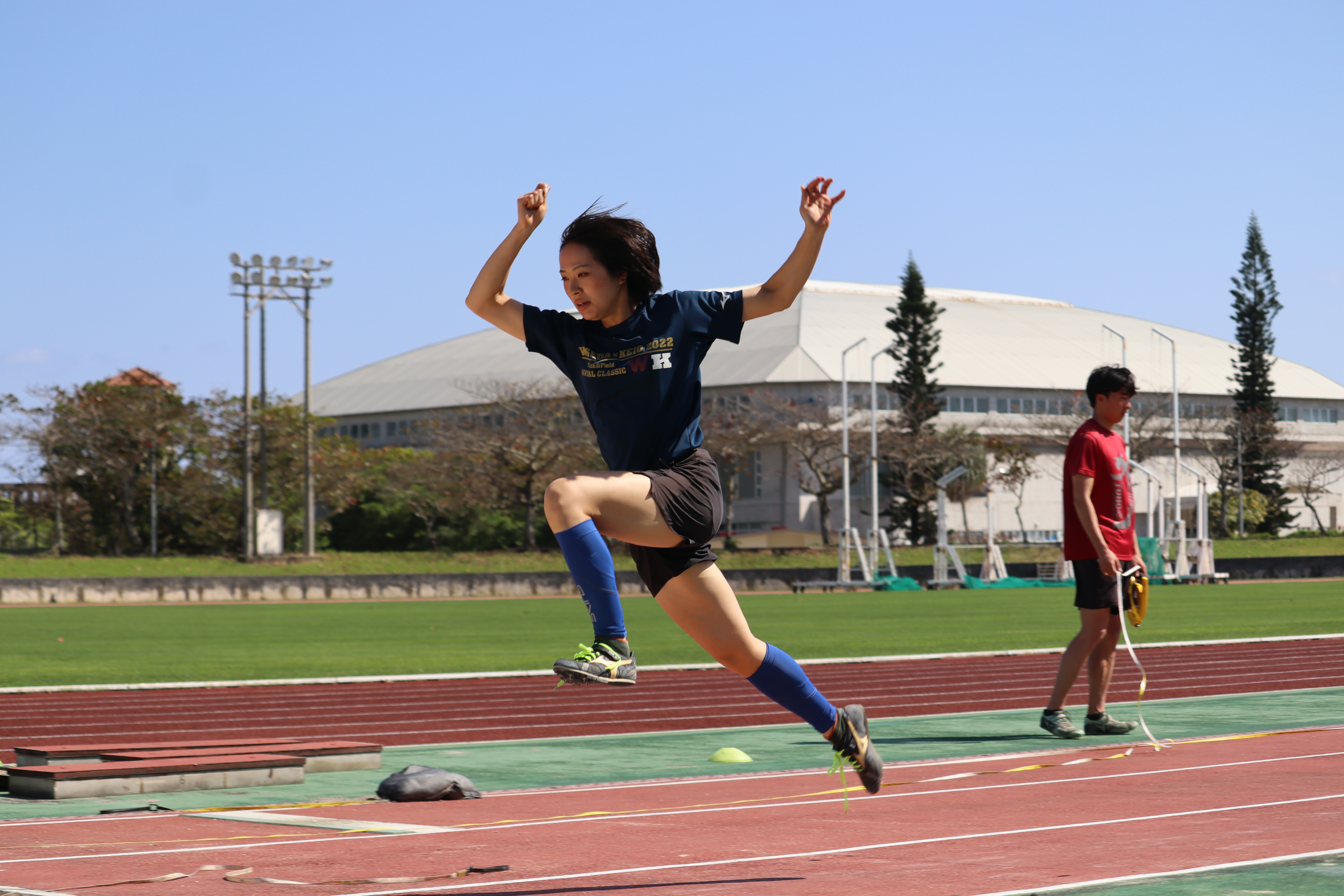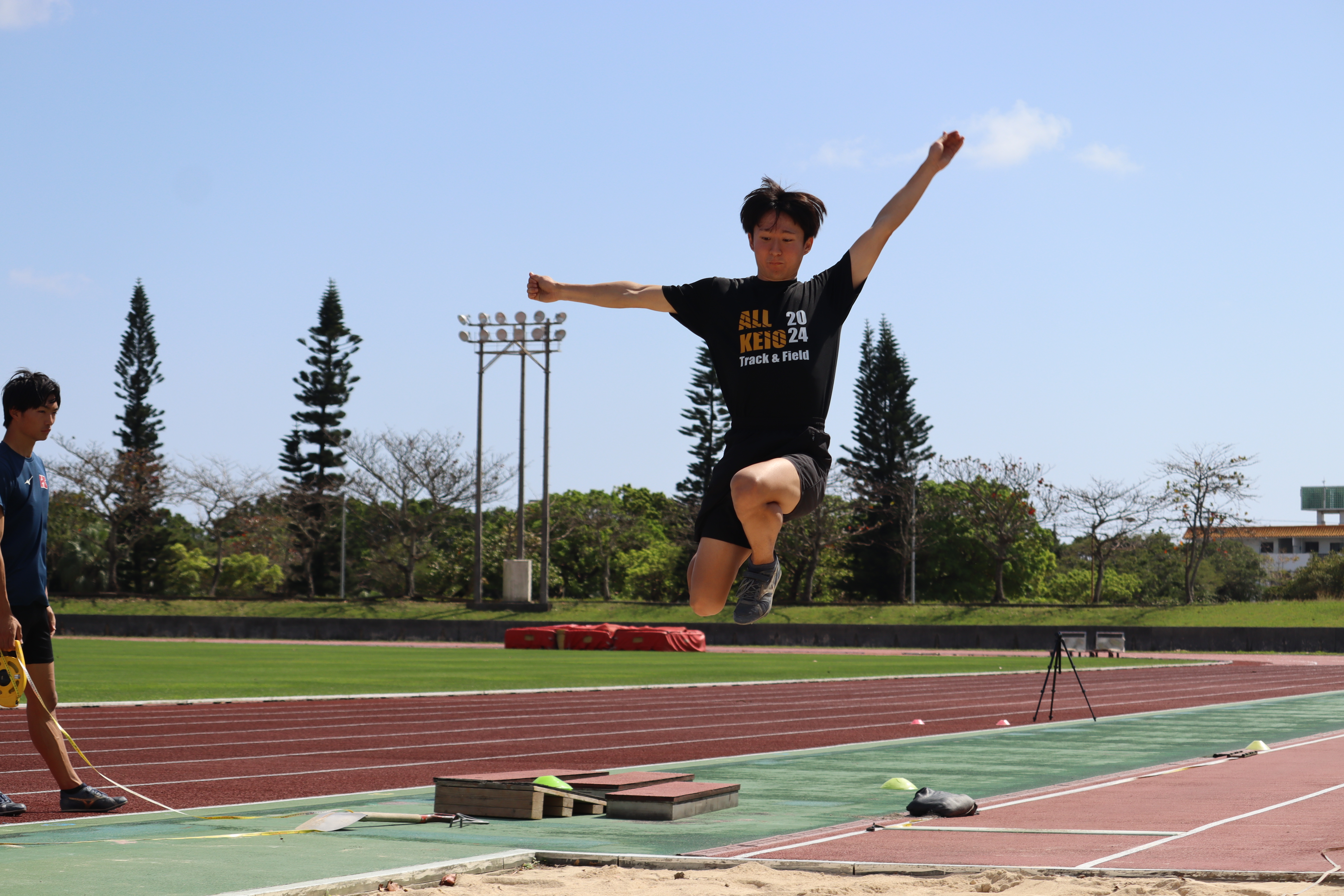 午後は試合形式で全助走の跳躍を実施し、暖かい気候の中で高い出力を意識して練習することができました。PBを大きく更新する選手も見られ、シーズンインに向けて非常に良い準備となりました。また、試合形式にすることで緊張感の中での集中力や、一本ごとの修正力も高めることができました。